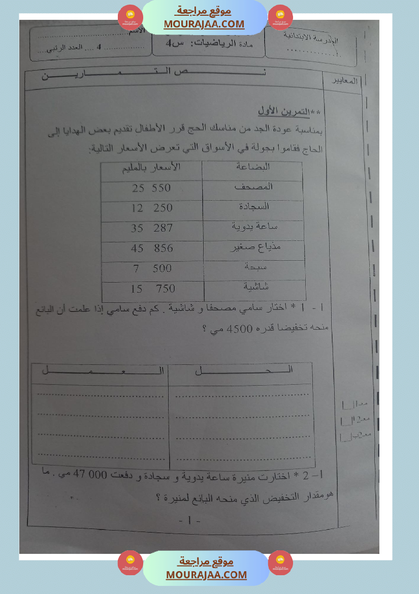 اختبار في الرياضيات ثلاثي ثاني لأبطال السنة الرابعة