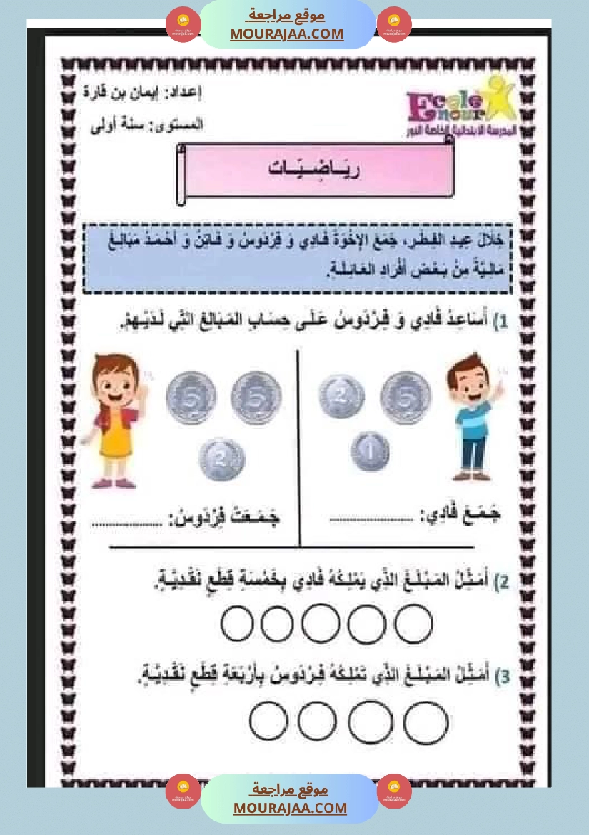 تحميل درس سنة أولى رياضيات في مادة رياضيات موجه لتلاميذ سنة أولى ابتدائي من التعليم الابتدائي بتونس، مع شرح مبسط يساعد على الفهم السريع ويعتمد على المنهج التونسي.