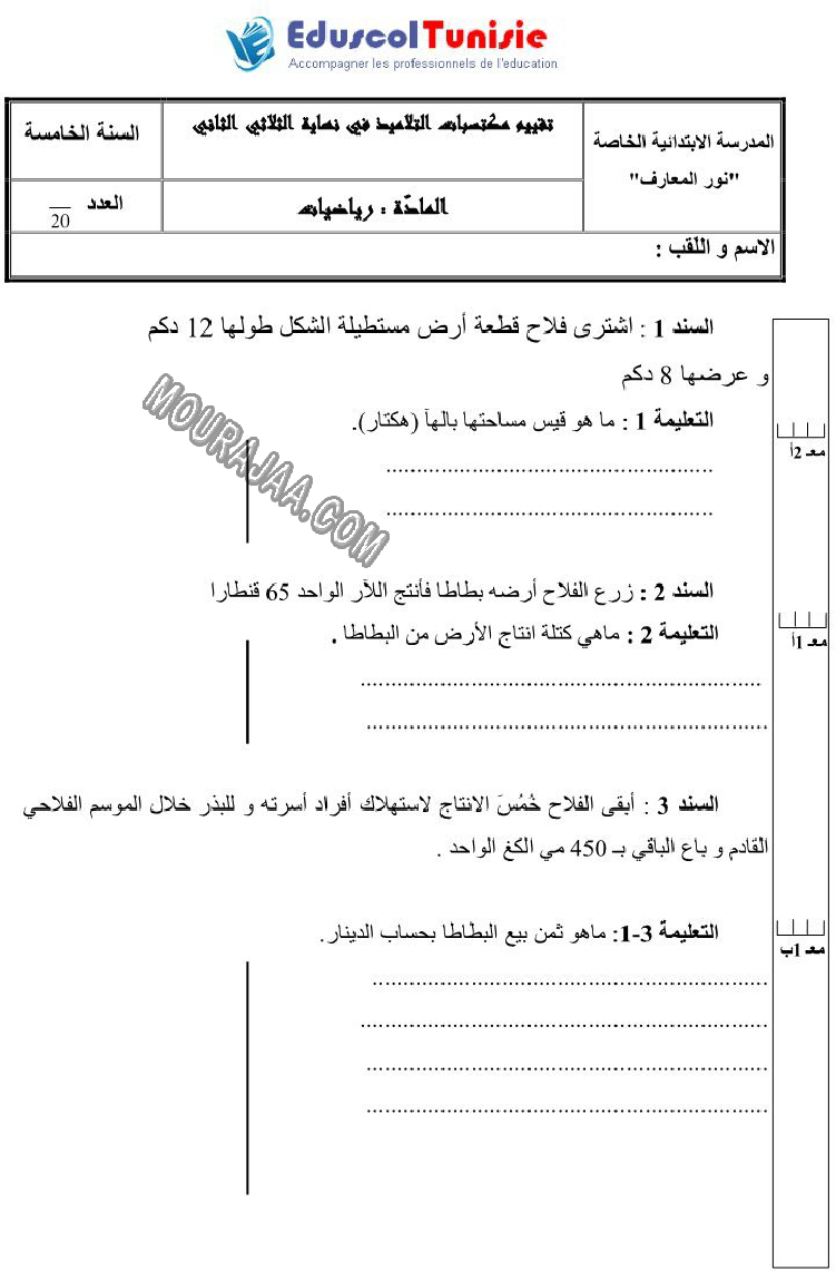 امتحان رياضيات سنة خامسة ابتدائي الثلاثي الثاني مع الإصلاح