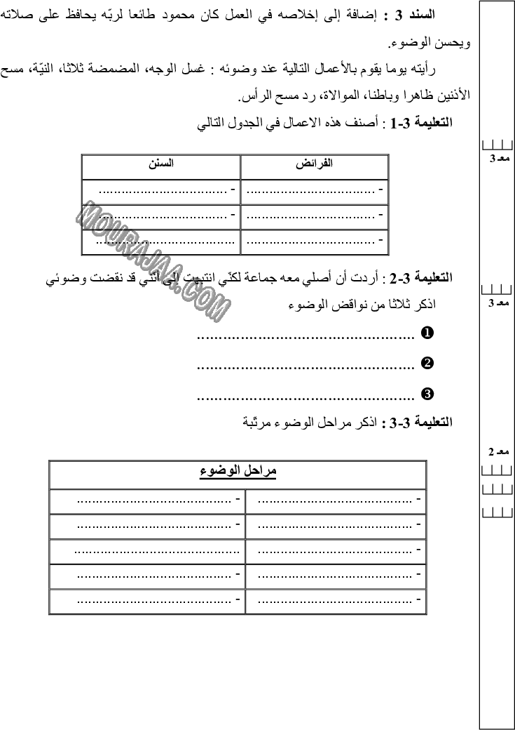 امتحان تربية اسلامية سنة سادسة ابتدائي الثلاثي الأول مع الإصلاح