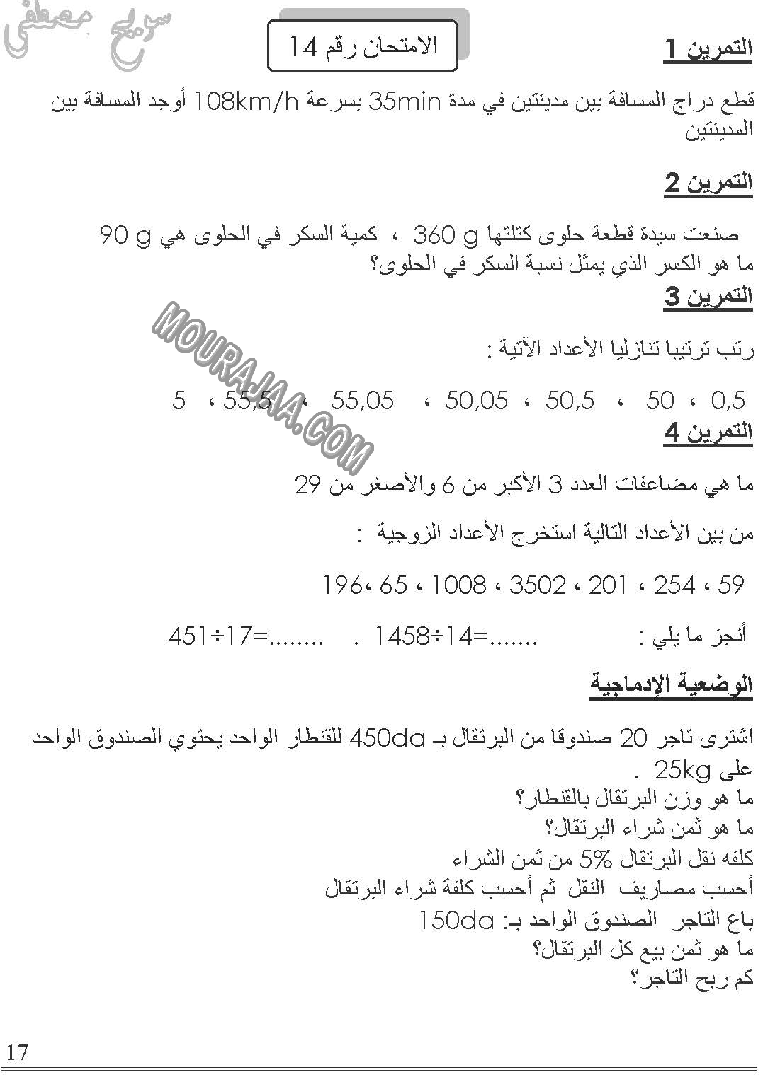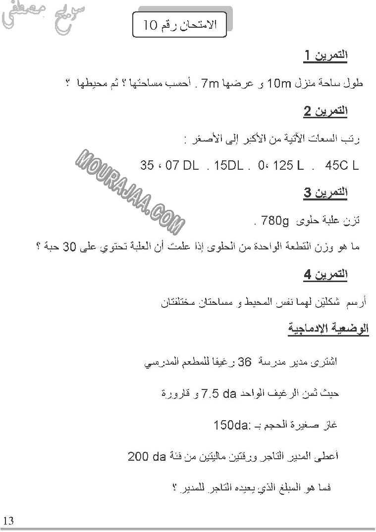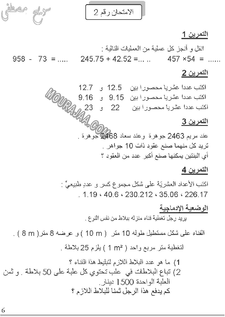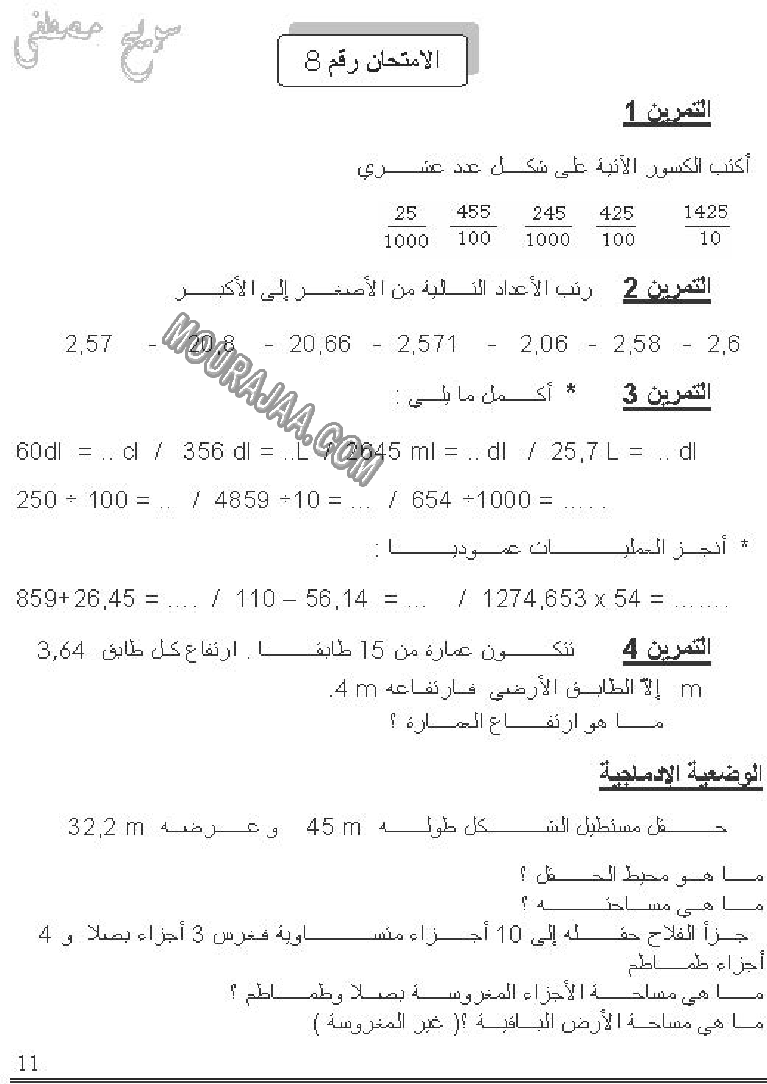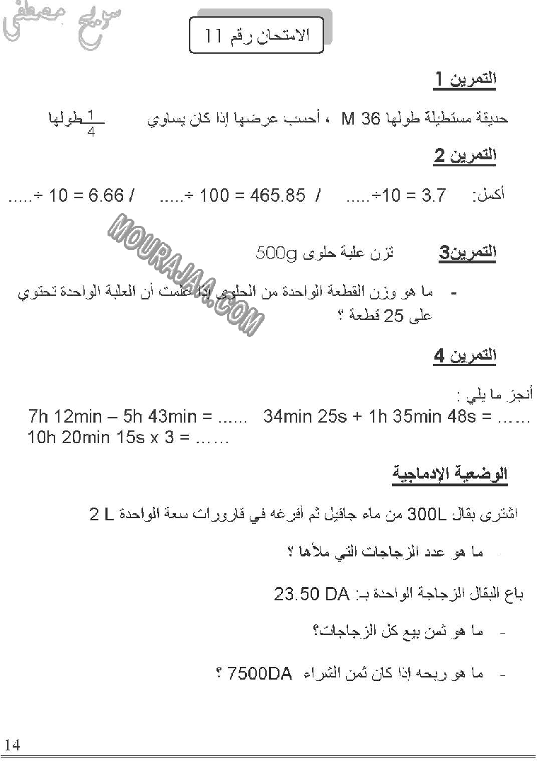 امتحان رياضيات سنة خامسة ابتدائي الثلاثي الثالث مع الإصلاح