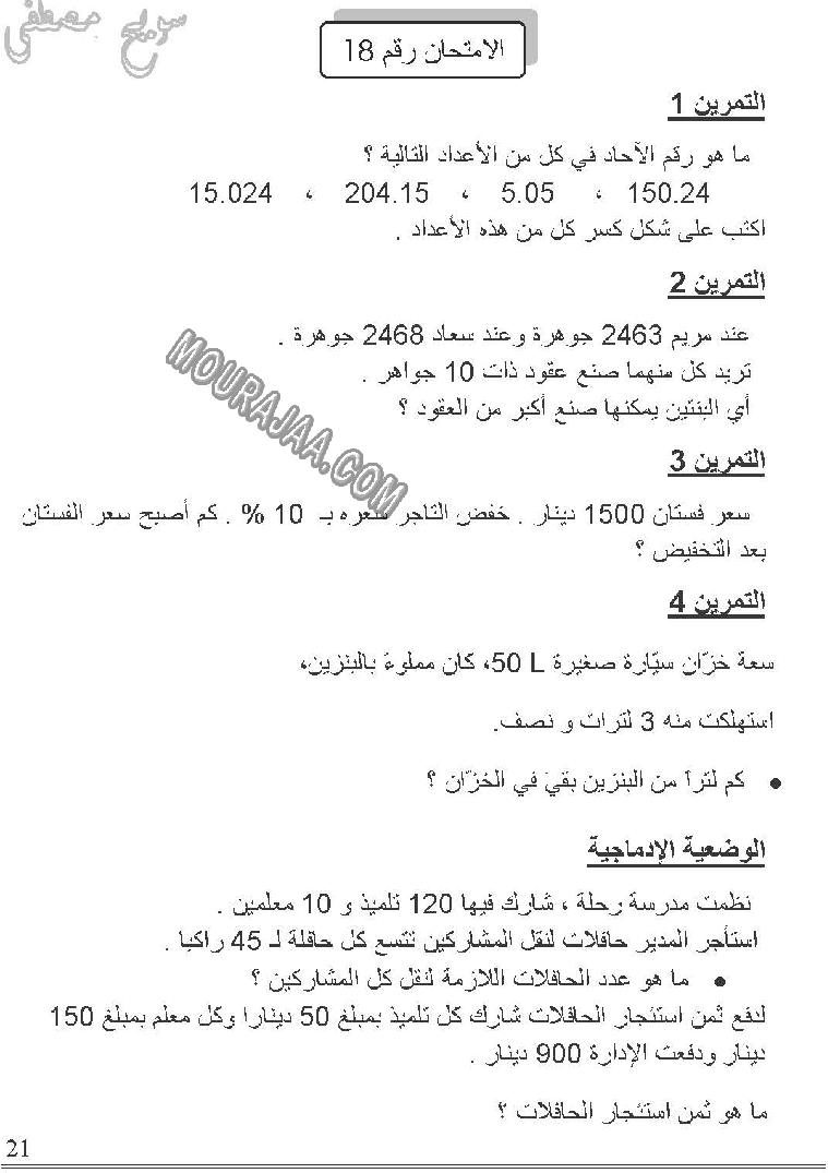 ???? هذا الامتحان مخصص لتلاميذ سنة خامسة ابتدائي بتونس لمساعدتهم في تقييم مستواهم في مادة رياضيات والاستعداد الجيد للامتحانات الرسمية.