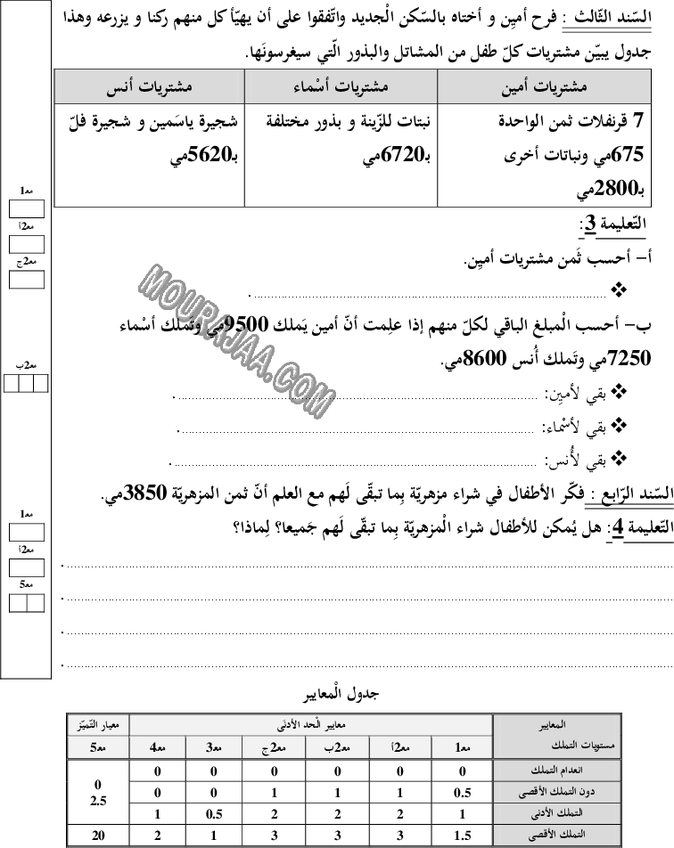امتحان رياضيات سنة ثالثة ابتدائي الثلاثي الثالث مع الإصلاح