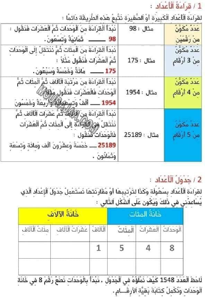 📚 هذا الدرس مخصص لتلاميذ التعليم الابتدائي لمساعدتهم على فهم درس قراءة الاعداد - جدول الاعداد - الاوزان - الساعات - جدول الضرب في مادة رياضيات بطريقة سهلة ومنظمة.