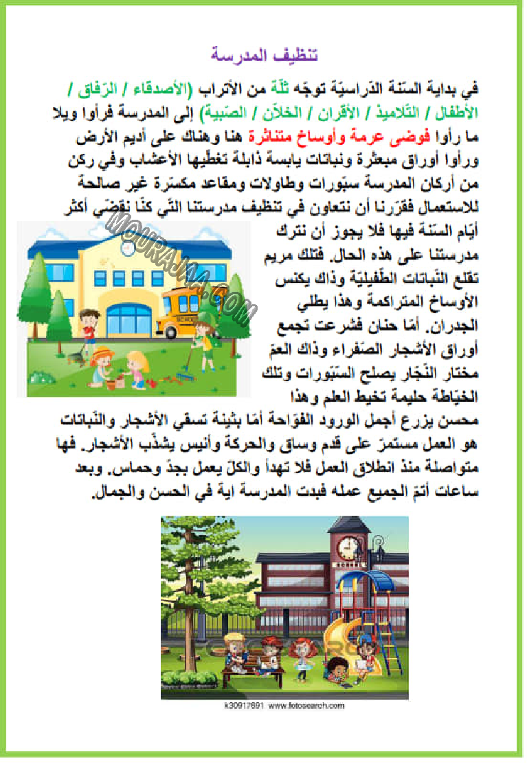 • موضوع إنتاج كتابي حول تنظيف المدرسة