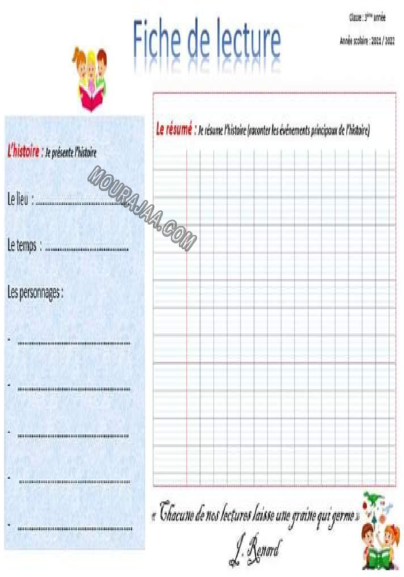 Télécharger une expression écrite sur le thème fiche de lecture, destinée aux élèves de troisieme de l’enseignement primaire en Tunisie.