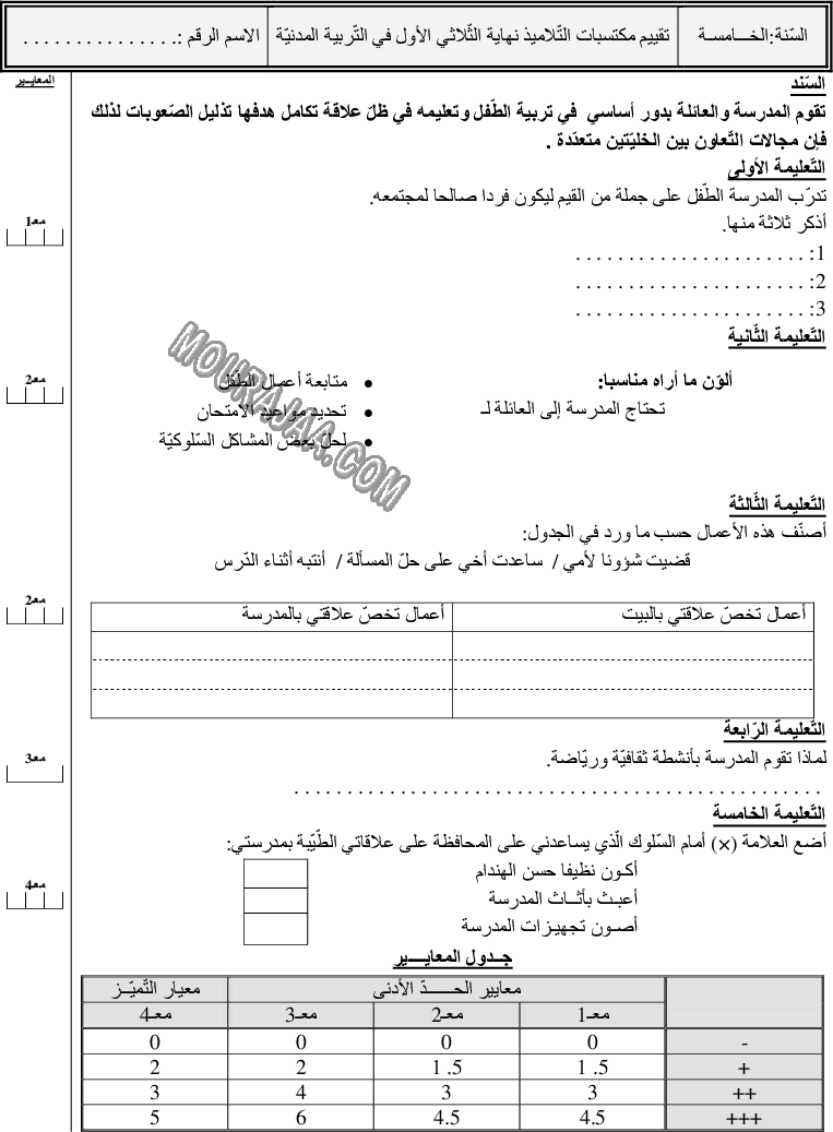 ???? هذا الامتحان مخصص لتلاميذ سنة خامسة ابتدائي بتونس لمساعدتهم في تقييم مستواهم في مادة تربية مدنية والاستعداد الجيد للامتحانات الرسمية.