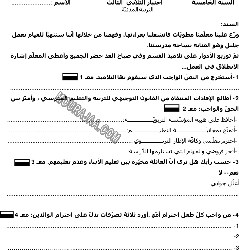 امتحان تربية مدنية سنة خامسة ابتدائي الثلاثي الثالث مع الإصلاح