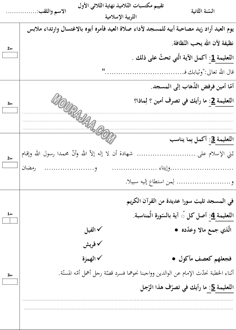امتحان تربية اسلامية سنة ثانية ابتدائي الثلاثي الأول مع الإصلاح