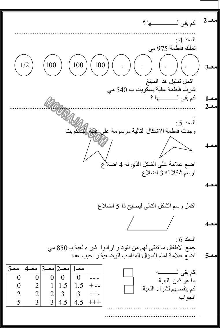 امتحان رياضيات سنة ثانية ابتدائي الثلاثي الثالث مع الإصلاح