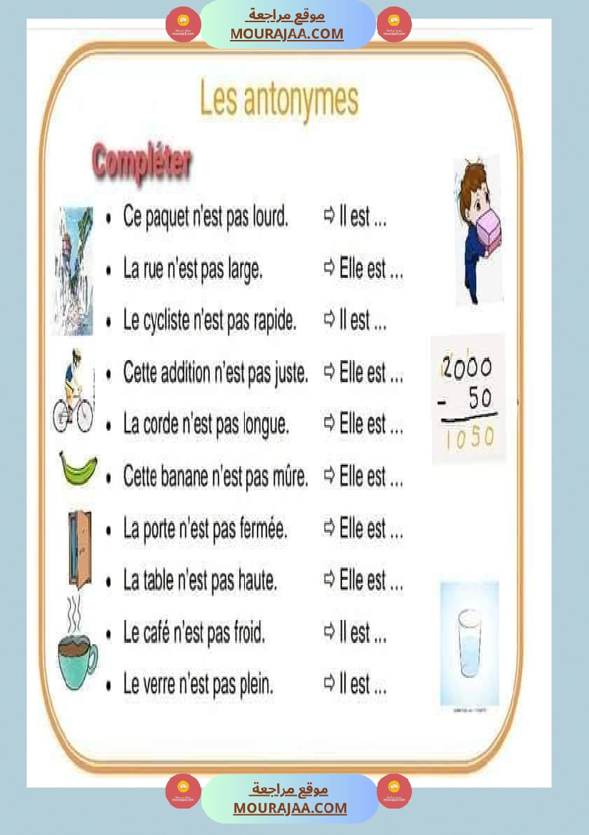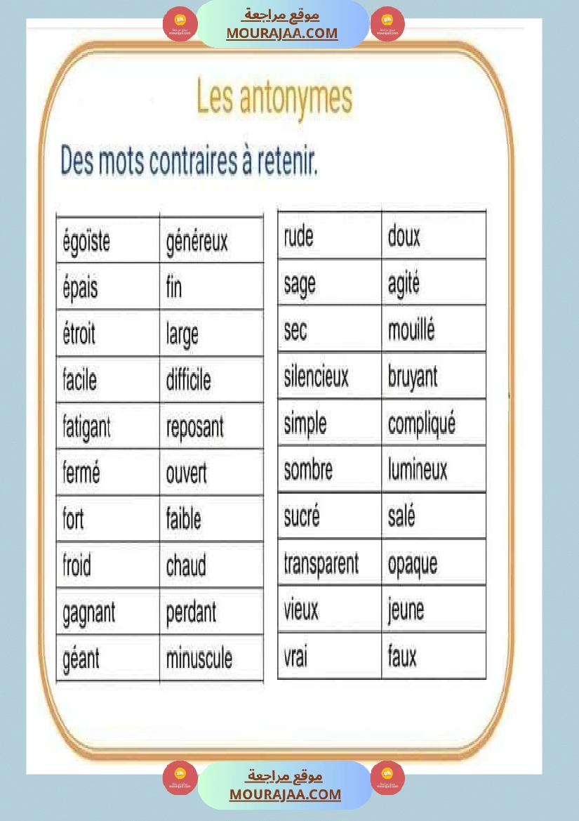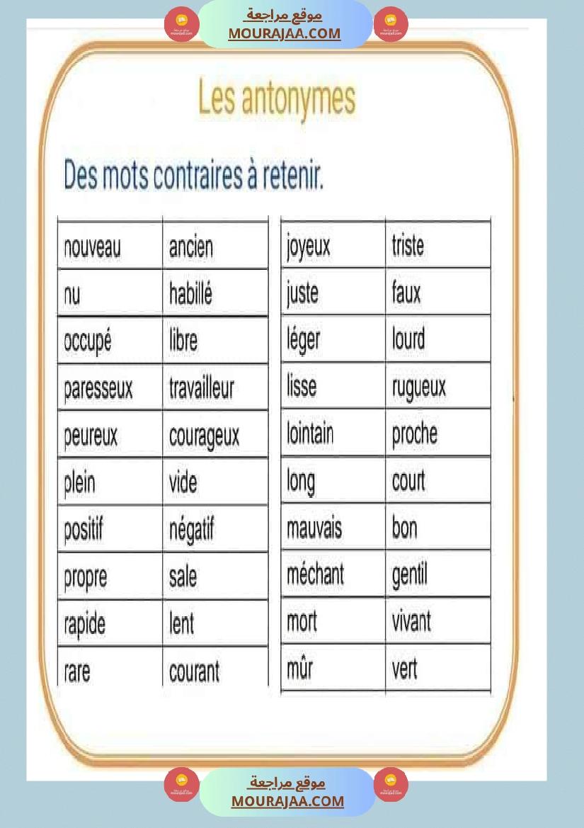 Télécharger la leçon les antonymes en lect_fr, destinée aux élèves de cinquieme de l’enseignement primaire en Tunisie, avec une explication simple et claire.