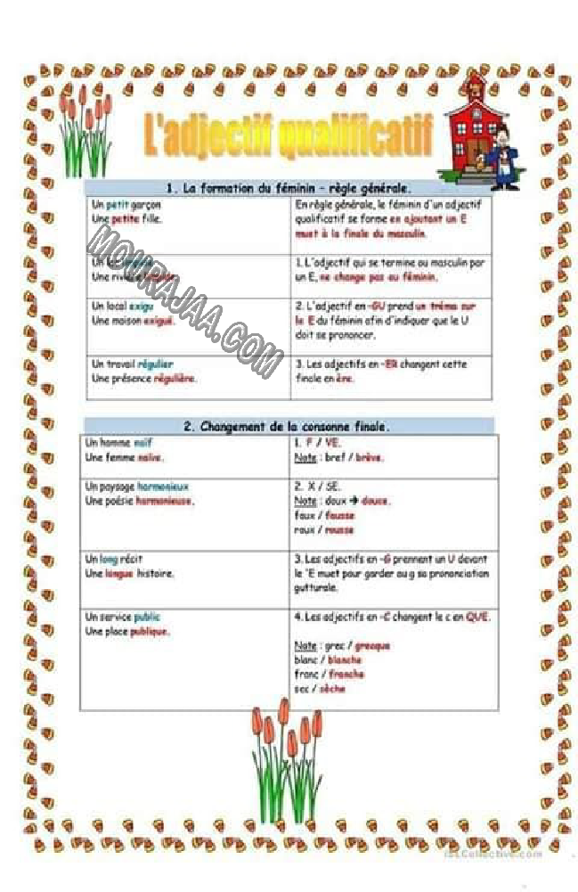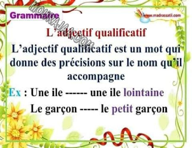 Télécharger la leçon les adjectifs qualificatifs en lect_fr, destinée aux élèves de deuxieme de l’enseignement primaire en Tunisie, avec une explication simple et claire.