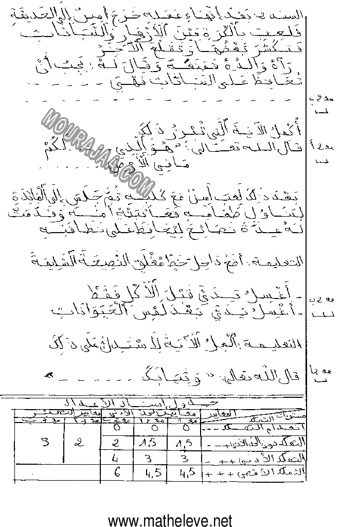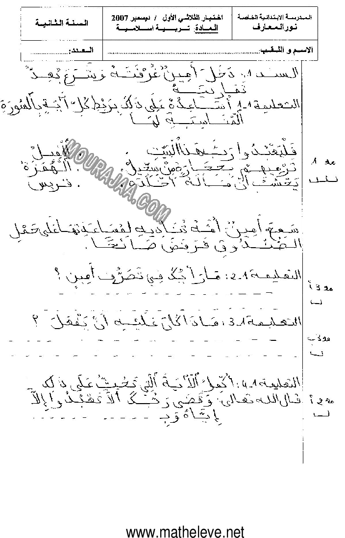 امتحان تربية اسلامية سنة أولى ابتدائي الثلاثي الأول مع الإصلاح