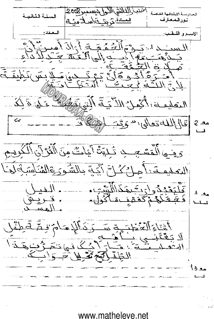 امتحان تربية اسلامية سنة أولى ابتدائي الثلاثي الأول مع الإصلاح