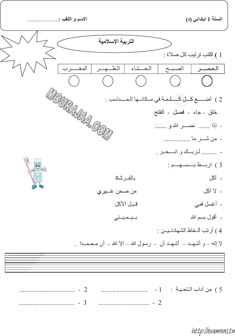 ???? هذا الامتحان مخصص لتلاميذ سنة أولى ابتدائي بتونس لمساعدتهم في تقييم مستواهم في مادة تربية اسلامية والاستعداد الجيد للامتحانات الرسمية.