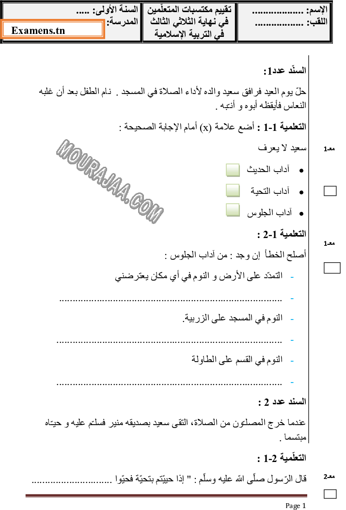 ???? هذا الامتحان مخصص لتلاميذ سنة أولى ابتدائي بتونس لمساعدتهم في تقييم مستواهم في مادة تربية اسلامية والاستعداد الجيد للامتحانات الرسمية.