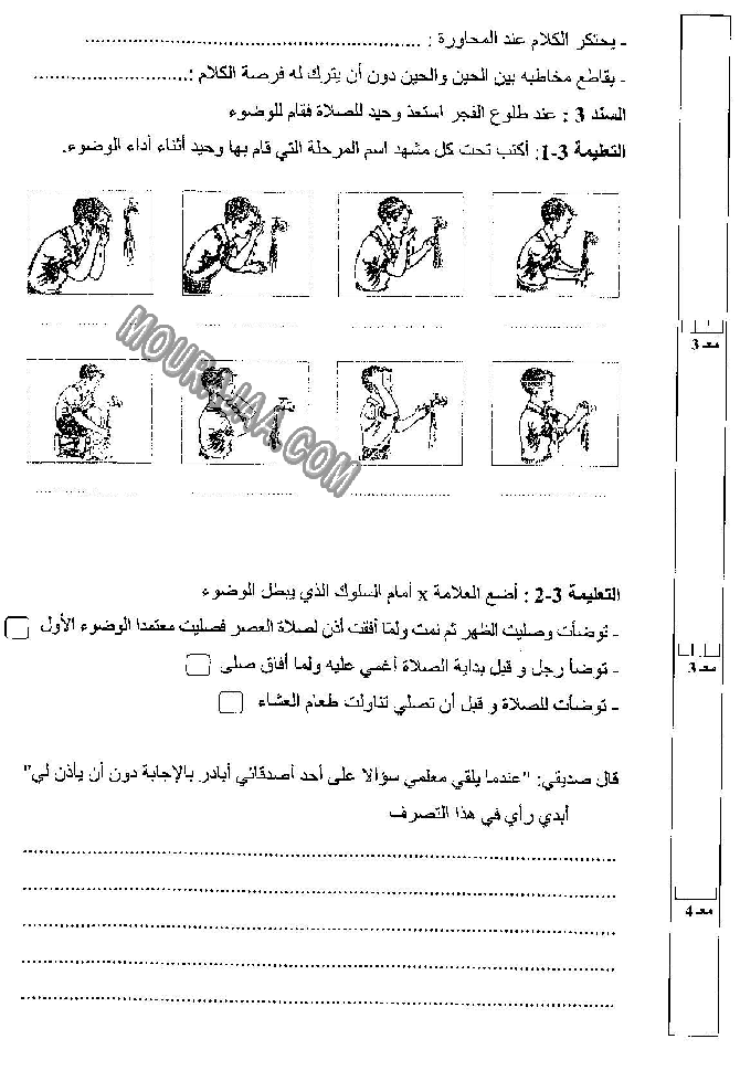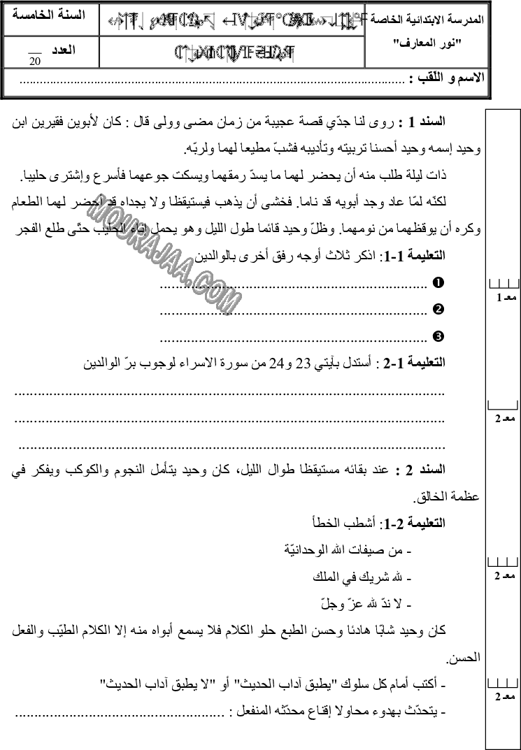 امتحان تربية اسلامية سنة خامسة ابتدائي الثلاثي الأول مع الإصلاح