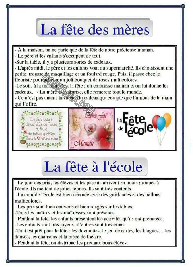 Télécharger une expression écrite sur le thème fete des mere, destinée aux élèves de quatrieme de l’enseignement primaire en Tunisie.