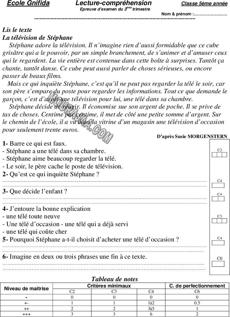 Examen lect_fr cinquieme troisième trimestre avec correction
